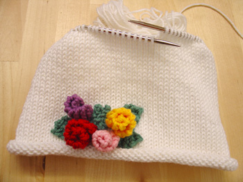 I like the hat as is also. The hat with the flowers going all the way around just seemed like too much to me. Way not use the roses to make matching mitts and maybe even a cardigan?
