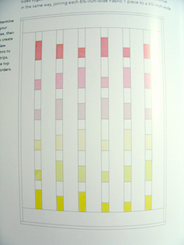 Joelle Hoverson does such a good job in this book coming up with clean, simple designs that are striking but not overly complicated. In this design, she's essentially got horizontal stripes of several different solids, but since they're broken up into columns and separated again with the background fabric, the result is really neat. This was going to be perfect for S's rocket quilt!