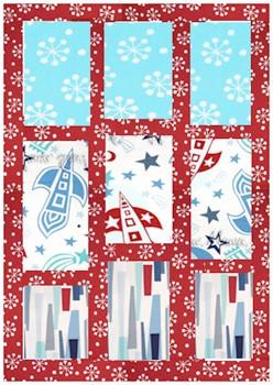 He liked it and we got to work on designing the quilt. He would have had me just sew three strips of fabric together - stripes on the bottom, rockets in the middle and blue sky on top - and wrap his favorite color red all around it, but I wanted something a little more interesting. I flipped through the few quilt books and magazines I have and found this design, Just Sweet Enough, from Last-Minute Patchwork + Quilted Gifts . (Love that book!)