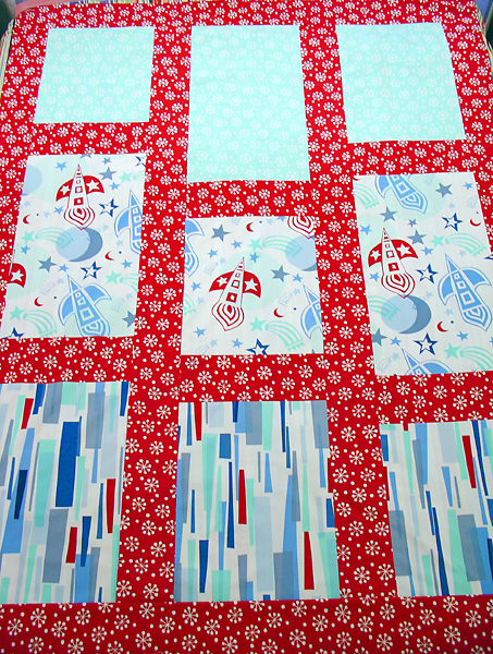 Yes, he suddenly asked if I would make him a quilt. I suspect that by now he knows that the answer to this sort of question will always be an enthusiastic YES! And not only did I say yes, but, since I'm constantly trolling the internet for fun and fabulous fabrics, I'd already bookmarked some awesome rocket fabric.