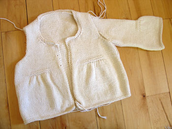 The little white smock cardigan is as cute as ever, but it's about to end up a vest if I can't get these g.d. sleeves in! I thought the denim yarn would shrink the armholes a bit more but those sleeve caps are still a little small. I've got to really finesse this seaming to make it work.