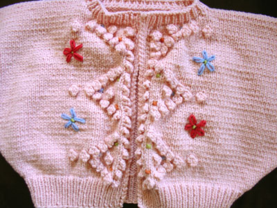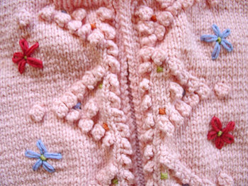 Wee one's bonbon sweater (who even remembers that one - it was so long ago!) has been patiently waiting for its embroidery. I thought I had so many color choices to pick from in my stash, but I think what was keeping me from just doing it was that I wasn't completely happy with my red/pink options. I finally just pulled three colors I liked from the bag, sat down at Knitsmiths and did the darned embroidery.