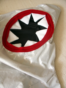 The pillow is the last thing left for me to make for S's shark costume. It will sit inside the costume on top of S's head to keep the top of the costume, the shark nose, nice and pointy and keep the mouth opening right in front of S's face so he can see. I've been resizing this pattern as I go, since the only version of the now out-of-print pattern that I could get online was the adult size. It's been tricky getting everything in the right spot. With the original sizing, the fin would have been coming out of his butt! To get it all right, I've resewn the body about four times, each time bringing things up and in. We've finally got it to where it'll work with the mouth in front of his face, the fin on his back, and the sleeves near his arms, but it all depends on that pillow keeping the nose up. No pressure.