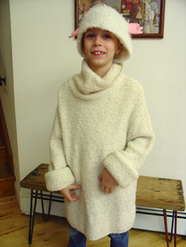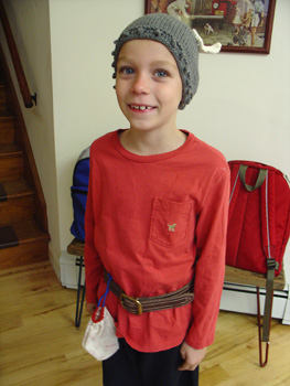 B insisted that he had to be Fluffy . Insisted. I suggested maybe he'd like to be Obelix - he's got some blue and white striped pajama pants that would be perfect. Or maybe Stink - all he needed was stinky sneakers and some gel to make his hair spiky. But no. Fluffy is "soooo funny" he said; he had to be Fluffy. My make-shift Fluffy costume - with an old fuzzy Banana Republic sweater - isn't perfect, he told me, but it's "fine". (I think he looks adorable!) Fluffy's hat is a hat I knit for myself ages ago. I sewed up some little pink ears, following strict design instructions from B, and stitched them on the sides. I think it's pretty cute. It's certainly fluffy. And B can do the funny, no problem.