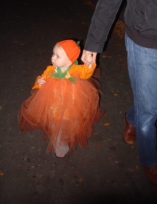 I topped off her pumpkin tutu with one of the pumpkin hats I knitted for the boys for their very first Halloween. She was greeted at every house with "awwwww"s. What more could a crafty mom ask for?!