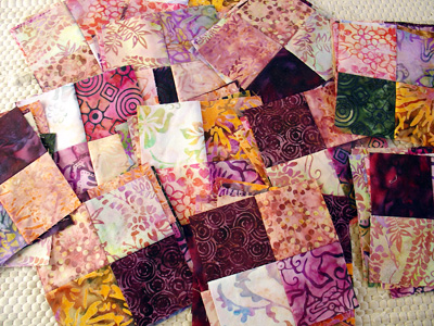 I sewed up these simple four-patches (there's 63 of them in total, for a 7 by 9 block quilt) in a couple of nights. I'm making a quick quilt for a friend of the family who likes purple. I didn't want it to scream purple - you know how it is when people figure out you like something and then every gift you get is about that and just because you like cats doesn't mean you want to have cat posters and cat mugs and cat brooches and cat plant holders... - so I chose these batiks in a variety of purpley tones. I love the splashes of orange and green in there too!