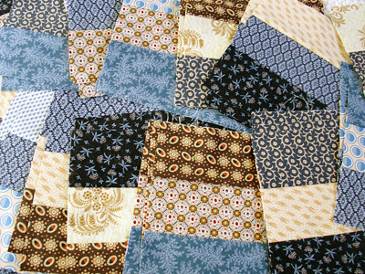 These rail fence blocks are for a second quilt I'm making for other friends of the family, whose taste I'm not so sure about. Well, the thing is they don't really seem to have any particular tastes, no favorite colors, no specific style. Add to that the fact that it's a rather masculine household and I decided the best thing I could do was to go neutral. When I was choosing the fabrics, I was focused on selecting not too fancy, not too stylized, not too threatening beiges and blues. I'll be framing the blocks with a simple sashing of a very neutral but warm golden beige. I want it to be something that can lie around in the corner of a non-descript sort of room and just look like a warm quilt your son would thoughtlessly pull over himself if he got chilly. Neutral but nice.