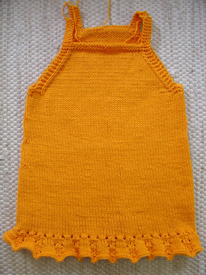 The good news is that the dress fits great! I made a ton of mods to the original pattern, so this was by no means certain, but I got lucky. After casting on a different amount to accommodate the ruffle stitch from the comfort zone skirt pattern, I ended up with about 20 extra stitches for the body of the tank. I worked some paired decreases near the upper section of the skirt to get back down to the proper number. I also added 3 or 4 inches to the tank so it would be more dress-length than tunic-length. And finally, I lowered the neck in the front of the tank so it wouldn't come up quite so high on her throat. Seriously, the neck is sooo much better this way. I can't wait for the modeled pictures on this one!