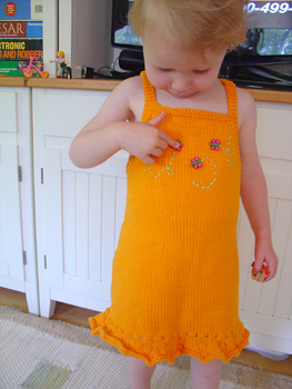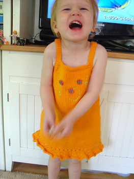It's darling! I love the butterflies and the cheery orange yarn. My kiddo is always annoyed when I make her try stuff on too. You know it's a true success when she won't take it off!