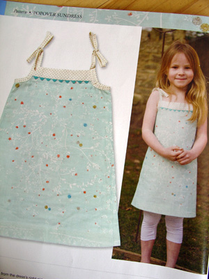 The fabric is from Tina Givens' Treetop Fancy line. Tina Givens makes lovely, feminine larger-scale prints, often with only a few colors but including a big pop of color like the huge pink flowers here. (Her patterns, like the zig zag girl dress I made for wee one, are great for showing off those large prints). The pattern I'll be making this time, however, is another Oliver & S pattern (loooove her stuff!): the Popover Sundress.