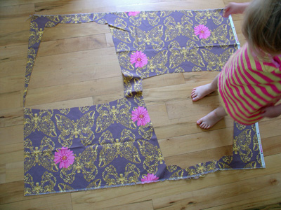 I cut out the large dress pieces last night and this morning, wee one played hopscotch in the holes!