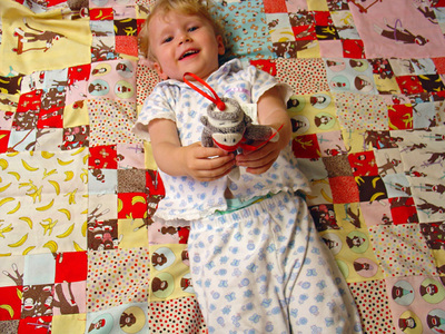 And in the other room, wee one was rolling around on her funky sock monkey quilt top (also awaiting quilting). As soon as she saw it, she dashed off to find her sock monkey toy so he could monkey around with her on her monkey quilt.