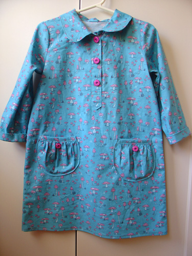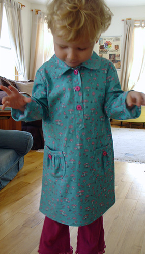 Wee finally got to wear her Oliver & S Jump Rope Dress today! I had promised her it'd be all done for Tuesday and I did finish the sewing Monday night, but then I realized I had neglected to buy any buttons! I picked some up at the store on Tuesday, sewed them on and then decided on Wednesday that they looked so good, I needed two more for the pockets. This morning when she saw the dress hanging up, she said "that my mushroom dress? with the pockets? is all done?" Yes, yes, and yes!