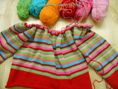 It took two weeks and considerably more television than I'd expected, but wee's stripey Mandarin Petit sweater is now together, with two sleeves and incipient raglan shaping. I'm nearing the end!