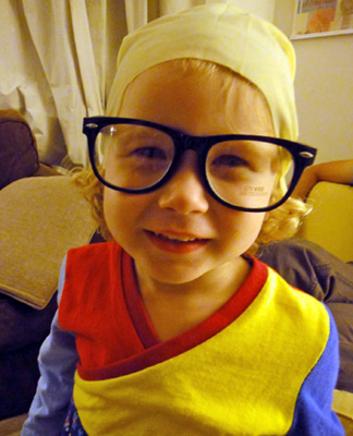Great costume idea! We always spend Halloween with the grands & this will be the first year in several that I haven't made at least some of their costumes. All 3 are obsesses with Harry Potter (my daughter overheard the youngest, Baby M who is a few months older than Wee, say to her next older brother, "Bloody Hell!" when something went awry during their play at the dining room table) So this year I bought their costumes - the oldest is going to be Lord Voldemort, the middle (the ony one with my brown hair & eyes & he even wears glasses) will be Harry & Baby M is going to be Hermione. My daughter did refuse her request to dye her lovely blonde locks the same color as Hermione's! It actually was no more expensive to buy them than to make them & freed up time for the knitting of grands' socks! (I try to make at least a pair for their BD's - one in early Sept & the other 2 the first half of Nov) & another pair for Xmas. They LOVE handknit socks!