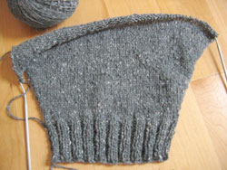 The lower part of the front of the pop sweater, which just goes up to the end of the armhole shaping. The knitting is short-rowed and stiches are kept live around the neck opening, so you can come right back and knit the ribbed edge. The short rows avoid the stair-step look that comes from binding off and makes that neckline look so much smoother.