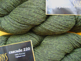 I have been the recipient of a yarn mitzvah - a very good yarny deed. A knitter friend of mine (one of the people who helped teach me to knit!) has developed chronic tendonitis and has come to the conclusion that he'll never knit through all of his stash. So he gave me this entire bag of Cascade 200 in a beautiful forest green.