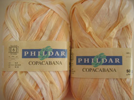 5 skeins of Phildar Copacabana in color #4 "naturel", which is beige/white variegated. This the same yarn I used to make my tiny tank a couple years ago (just in a different colorway). It's 100% rayon and knits up like a spongey cotton tape. There's 94m per ball at 14st/10cm.