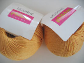 6 balls Phildar Licorne in color #101, "giroflee", a gorgeous orangey yellow. Licorne is Phildar's mercerized cotton, like Rowan's cotton glace, but it's much smoother and has a beautiful sheen. It's the same cotton yarn that's called for in the infamous cardi raye (just in a different color). It's 100% cotton, 120m per ball at 25st/10cm. It should be enough yarn to make a large tank or tee. Check the Rowan books for cotton glace patterns.