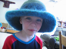 Located in a still-under-construction strip mall (the hotel employee giving me directions didn't believe that the store would even be open!), Knitters Mercantile is more store-in-a-box than Wolfe Fiber Arts was, but with comfy couches in the front and luxury yarns decorating the walls, I quickly forgot that I was in a strip mall. It actually reminded me very much of Knitting Hands in Brooklyn inside - just a bit smaller, and in Ohio. They had free cookies out on the tables to celebrate the opening, most of which my boys either ate or touched, and a little shelf of kiddie books in their huge book area that the boys dove into after I banned them from the cookies. B even fell in love with a sample felted hat and wore it for the whole hour and a half that we were there.