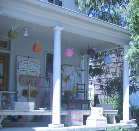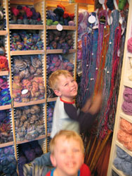 What Knitters Mercantile may be missing in atmosphere, Temptations (scroll down) in the suburb of Dublin, has in spades. This store is jaw-droppingly gorgeous, with yarns of every kind divided in different rooms of an old house. There's the baby yarn sitting room (with coloring books for the boys), Noro/Lamb's Pride/Lopi living room, several bedrooms filled with yarn upstairs and downstairs, a sock yarn closet, novelty hallway, and the needles and notions bathroom! And they also sell antiques, so the yarns aren't just in bins, but in beautful old pieces of furniture and lovely baskets and bowls. Yummy! The boys loved all the colors and textures.