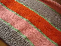 Aren't those stripes great! I totally adore them. The colors are so cool together. And to think that this was hand-me-down yarn from Amber's hubby's grandmother! Amber says that between bags of old Phildar yarn, a half-finished angora/alpaca sweater and lots of quality acrylic yarns, there was just this bread bag with totally retro colored mystery yarn. She brought it to the swap and it's like it's finally found what it was meant to be. I'm so keeping the bag, don't you know!