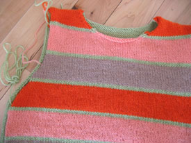 Anyhoo, back to the knitting. The body came out a little larger than I had anticipated. It's not too big, but after doing a lot of adjusting for my larger gauge, it seemed like it was coming out a little snug. Ends up that it will have the same sort of fit as the pattern in the Vintage Knits book. But it is most definitely longer. No crop tops for me, thank you very much. Instead of just doing more stripes to lengthen the piece - I was worried about messing up the sequence at the very top where the neck edge color needs to contrast with the colors on the shoulder - I made each stripe a few rows longer. This added a good two inches to the whole piece. It's gonna make reworking the sleeves a be-atch, though, since I need to keep the same overall shape while adjusting for my larger gauge and now longer armholes. The good news is that I think I have enough of the mystery yarn left over to do stripes on the sleeves as well.