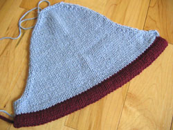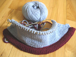 Now I've got an inch more of blue to work with before the gray comes. Result: the "shazaam" has been forced back towards the center. I'll have to go back later and cut these yarns on the inside and weave them in. Still, it's a fairly easy fix and is working pretty well.
