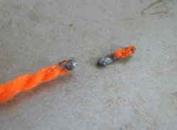 The yarn immediately melted and stuck to the match. Twice. On the third try, I got a small portion of it to light, but the flame quickly petered out, like when the wax from a candle smothers the candle's own flame. Alright, mystery solved.
