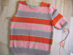 I'm so glad that I threw caution to the wind and went for stripey sleeves! I should have plenty of yarn to make sleeve number two. I am having a hard time with the sleeves though, because of how I lengthened the top. Keeping the same shape over a longer armhole, while making sure that the stripes still match up has been a real battle. This is my fourth attempt and the first that looks like it may have a real chance of fitting in the armhole. I'll sew it in this week to see if it's a keeper.