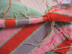 I carried the green yarn, which is used in two rows every fifteen rows, but cut the other yarns, since they didn't repeat for fifty rows. I'll have a lot of weaving in to do in the end, especially around those sleeves! But first before I do sleeve number two, I've got to give this whole thing a wash. The mystery yarn is a little stiff and I need to see if it's going to soften up enough before I go to the trouble of finishing everything.