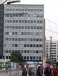 On a building at Alexanderplatz, from Döblin's Alexanderplatz: "See you at Alex. Freezing cold. Next year, 1929, will be even colder."