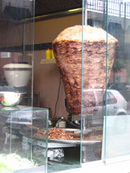 That's meat. It spins. They cut some off for you, stick it in a pita pocket, and you eat it. The Döner.