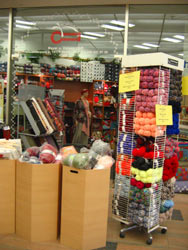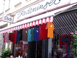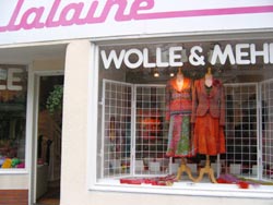For contrast, let me show you a little knitting/sewings shop we came across while looking for an ATM in the U-Bahn shopping area at Alexanderplatz. It was called Knopfloch ("buttonhole") and was full of lots of primary-colored, acrylic-y yarn and the smell of grandma. This is how the majority of knitting shops and department store knitting sections are here in Germany. Knitting is still pretty much an Oma activity here, so specialty yarn stores like we have in the states are really the exception. And, judging from the few I've seen, the specialty yarn shops tend to specialize in something else as well. La Laine (and the Wollkorb that I visited in Munich last year) both sold boutique-style clothes in addition to yarn. The ones at La Laine were knitted items with really impressive colorwork (see the suits in the window? they're knitted!).