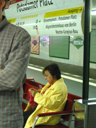 For the train ride to Berlin, I brought my Morehouse Merino shawl project. Casting on 250 stitches on a train with no stitch markers was a pain, but after that it was just knit, knit, knit, round and around and around. And since I've learned to knit and read at the same time, I could even plan a few sight-seeing trips for us. With all the excitement in Berlin, I didn't get any more knitting done on the shawl after the train ride though. Standing next to this woman at the Potsdamer Platz U-Bahn was as close as I got to knitting for the rest of the trip.