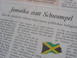 And speaking of the German government, here's the latest on the he said-she said debacle that has resulted from the election. The various parties are trying to put together a coalition that would have a majority in parliament. Each party here is represented by a color, which gives the Germans the opportunity to come up with fun names for their government - for example, a Red/Yellow/Green coalition (sort of like the Democrats/ the Libertarians/and Greens) is called an Ampel, or stop light. The current debate is whether the possible Black/Yellow/Green (Republicans/Libertarian/Green) coalition should be called a Schwampel (a contraction for Schwarze Ampel or "black stop light") or, even funnier, a Jamaica coalition. I don't know if I'm really for that coalition, but I do like to say Schwampel.