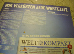 In the Berliner U-Bahn: "We can shorten any wait." Romeo and Juliet summarized for the 3 minute subway wait, the 1 minute wait, and the 10 second wait: "Romeo meets Juliet. Love at first sight. Secret wedding. Adults make difficulties. Stupid misunderstanding. In the end, both dead."