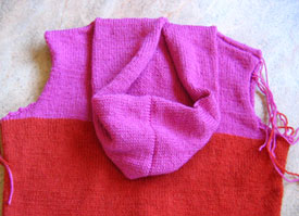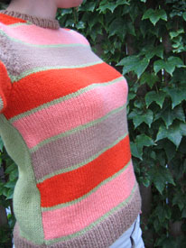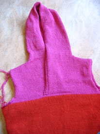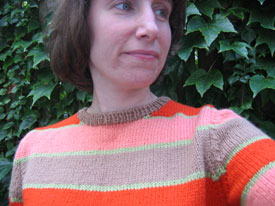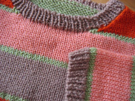 She's even better than I had hoped. I have no idea what the original owner made, or was planning to make, with this yarn (and no idea why she put the remaining yarn in a bread bag!), but the colors are awesome together. And the green Classic Elite Bazic is totally cool. Since the acrylic hand-me-down yarn wasn't top quality, I wanted to snazz up the sweater with a tubular cast on. It gives it a nice finish and the coordinating kitchenered bind off for the neck was new to me.