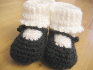 They're crocheted booties that look like mary janes with little ruffled socks. Aren't they adorable?! Thanks so much - I love them. And they were a huge hit at Knitsmiths. I hope they'll ooh and ahh that much when the baby comes!