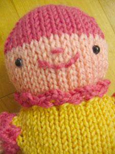 I couldn't resist the girl-baby knitting any longer! After seeing Jess Hutch's knitted robots on the cover of the new Craft magazine, I remembered the little knitted toy pattern book she published last year (it's out of print now, so sorry, I don't know where you can get it anymore), flipped through it, and found this pattern for an adorable little dolly.
