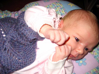 While I was working on my book and making a baby of my own, a couple of cousins had babies. I felt bad that I didn't get to make sweaters for the new little ones. Last night, in one of those moments where baby gives mommy just what she needs to make it through another day, baby L let me get started on a sweater for one of them.