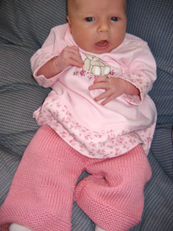 So just what was I knitting while I was in labor? More baby pants, of course! After finishing the drawstring pants from LMKG, I decided this time to just eyeball some babyGap pants and make up a little pattern for pretty pants for wee one. This is how far I got.