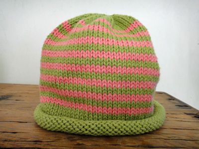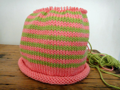 A few weeks later and I had another hat class and still more pink and green Spud & Chloe Sweater left over. It seemed like the perfect opportunity to make a hat just for wee one! This time I thought I'd make the reverse of my own green and pink hat: pink with green stripes. It looked awesome...