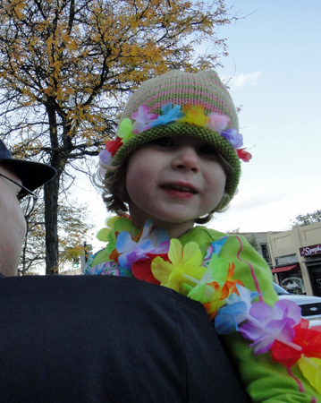 Halloween night was cold! Too cold for a hula girl without outerwear. So our little hula girl grabbed her mother's just finished hat and wore it for trick or treating!