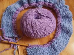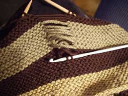 I've been knitting much less these last few days and, well, it's driving me positively stir crazy! In those down times during the day when I usually knit, I'm missing my needles pretty bad. I filled one gap by going to the yarn store and buying supplies for a few Christmas presents (stripey scarves for everyone!). And another evening was spent working out the technical details for my mother's asymmetrical vest (which I'm not knitting in garter stitch in one piece, but in stockinette in three). I also dreamed up a few new projects (a little down-time can be a dangerous thing) and even fantasized for a while about designing something myself (someday, when I can knit again).
