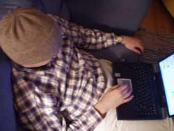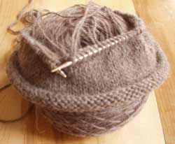 Hold the applause. I've had a heck of a time getting this thing started off right. I've never done double knit before. So I thought why not take it to Knitsmiths where I usually have so much fun chatting with everyone that I invariably make a giant mistake in my knitting. Yes, perfect - take everything to Knitsmiths and try to learn how to do double knit there! After some serious boo-boos followed by impressive saves, I got the double knit to work. Woo hoo. But it was only about wrist size and so it had to go. Look at how it separates into two sides of knitting when you take the needle out. Cool. Another start created a belt-sized version. Grrrr. After casting on for a third time, I knit the above which fits my head perfectly. Alas, it is not for me but my brother-in-law, so it too is no more. This double knit is a strange little animal. The total number of stitches is split between the front side and the back, which means you need to cast on twice as many but the stitches have a lot of stretch, so double knit objects are actually larger than they appear or so I've learned.