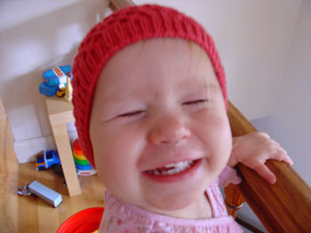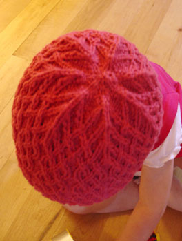 A big thanks to Jo for posting her mods to make a baby-sized shedir! My girl is actually a toddler now (a toddler?! can you believe it?!), so I upped Jo's numbers a bit to find a size between the baby shedir and the adult shedir. I cast on 112 stitches, which is seven pattern repeats, and worked 4 repeats of the main cable pattern. Like Jo, I skipped most of the plain knitting rounds between decrease rounds at the top. The finished hat doesn't quite cover wee one's ears fully (that calmer loves to shrink up), so I probably could have kept those rows in after all. I'd estimate it took about three-quarters of a ball of calmer (which is good, because I didn't have a full ball of this color to start with).