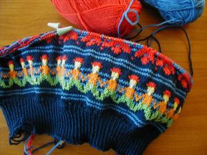 And a quick update of the two active projects at the moment: the front of the crazy continental (into the waist shaping) and the second sleeve of the Dale sweater (past the pattern and on to the stripes).