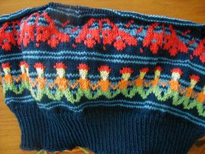Well, I was so excited about doing the pattern that I (like many before me) totally forgot about the increases. Oops! I realized it as I was almost done with the people pattern. But the sleeve was still big enough for me to get my hand, wrist and lower arm into it, so I decided it was plenty big for one of my boys and started the increases there. I increased a bit faster to catch up with the pattern by the end of the sleeve. I don't think it's noticeable.