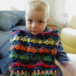 S really really likes the sweater. In fact he liked modelling it so much that it was hard to get a clear picture of both the sweater and him being happy about it! Here he was blurrily being excited about it right when I first put it on him. And here he was giving his mommy a little round of applause. Awwww.
